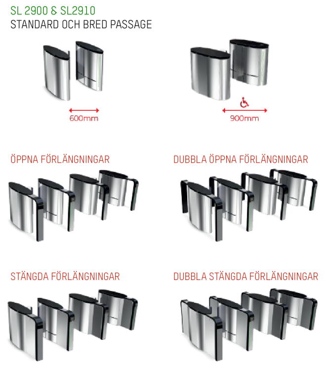 Passagerna finns med fria bredder på 600 (SL 2900) eller 900 (SL 2910) mm i kombination med de rörliga glashindrans höjder på 1000, 1200, 1500, 1700, 1800, 1900 ellerr 2000 mm.